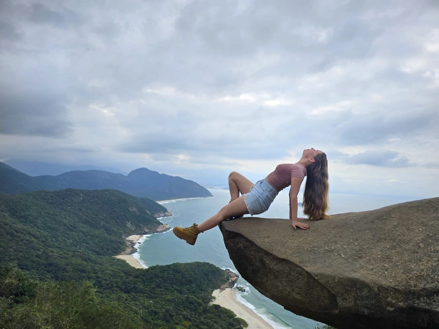 Passando por alguns bairros do Rio de Janeiro, como Barra da Tijuca e Recreio dos Bandeirantes, seguimos em uma trilha de aproximadamente 50 minutos até o topo da montanha para o tão sonhado momento da foto.